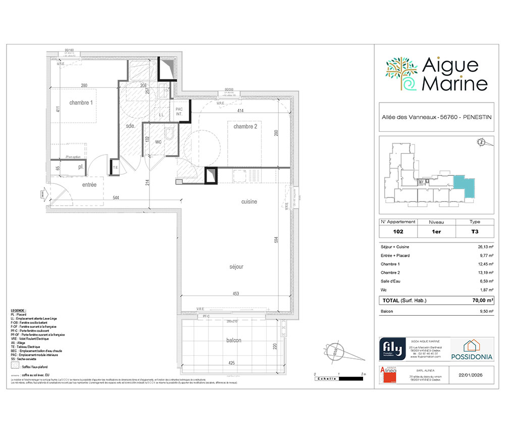 Vous souhaitez vous installer dans un cadre idyllique ou investir dans l’immobilier neuf en bord de mer en Bretagne ? Aigue-Marine est une chance unique d’acquérir un bien dans une résidence pensée pour vous offrir confort et bien-être tout au long de l’année. Nichée entre mer et nature, Aigue-Marine est idéalement située à Pénestin, au sud du Morbihan. Cette station balnéaire et son environnement naturel d’exception vous invitent à la découverte du célèbre site de la Mine d’Or avec ses falaises ocre ou encore du charmant port de Tréhiguier. Ici, les amateurs de nature, de randonnées et de plaisirs nautiques trouvent leur bonheur tout au long de l’année. Une atmosphère de vacances que vous pouvez prolonger en investissant dans un appartement neuf à Pénestin. Le programme Aigue Marine vous propose 28 appartements, du 2 pièces au 4 pièces, livrés clé en main, avec peintures faites et revêtements de sol posés. Que vous soyez à la recherche d’un appartement neuf à Pénestin pour y vivre à l’année ou pour profiter de la douceur des vacances, chaque logement a été conçu avec soin. Située dans un quartier résidentiel calme, à deux pas de la plage, cette résidence se distingue par ses lignes architecturales modernes et élégantes qui respectent le charme breton. Vous souhaitez en savoir plus sur ce programme immobilier dans le Morbihan ? Contactez dès maintenant l’équipe Fily Promotion afin d’être accompagné dans votre projet d’achat d’appartement à Pénestin, que ce soit pour une résidence principale ou un investissement locatif.
